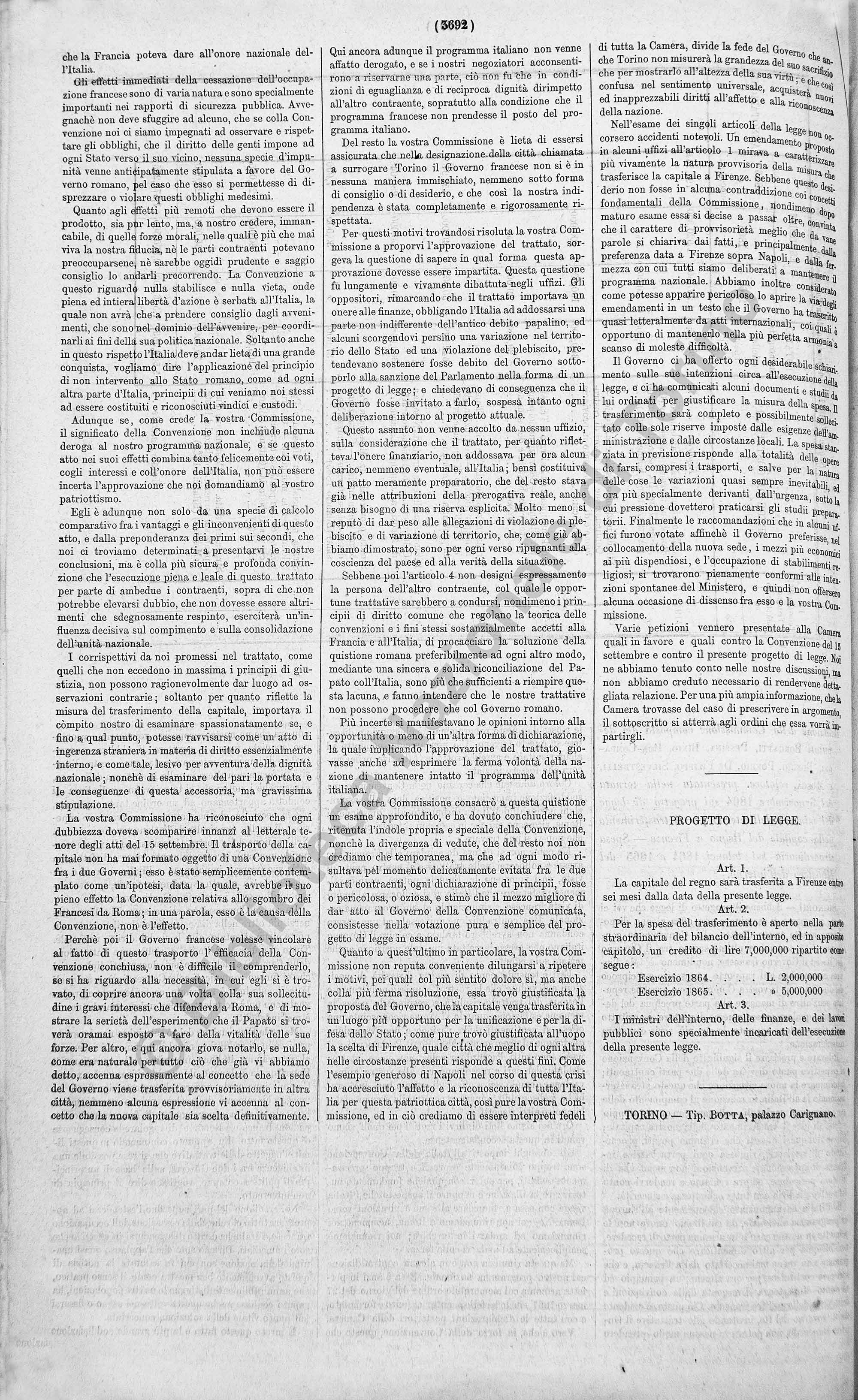Progetto di legge presentato alla Camera dal Ministero dell’Interno (Lanza) nella tornata del 24 ottobre 1864, per il trasferimento della capitale del Regno a Firenze.